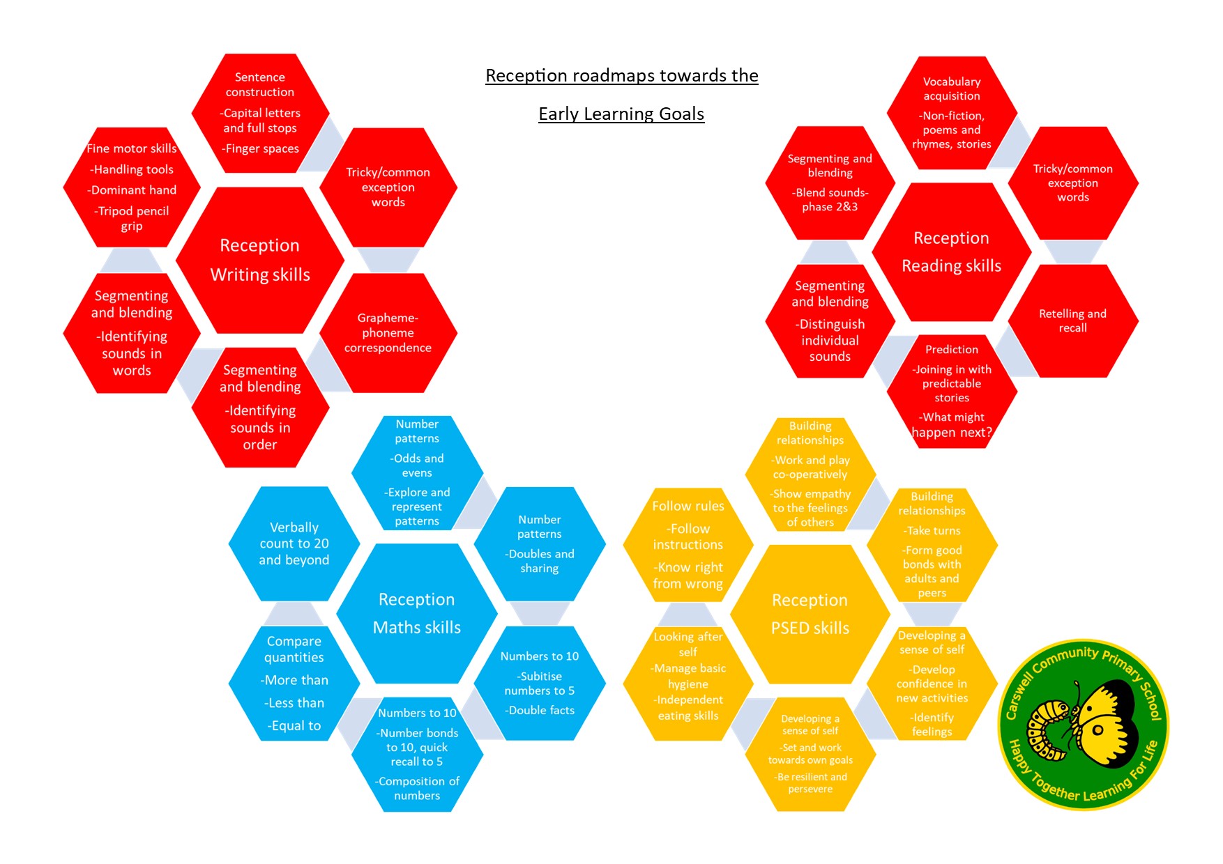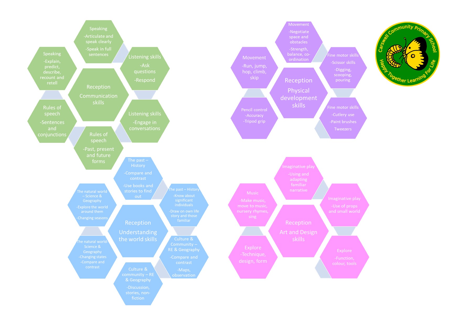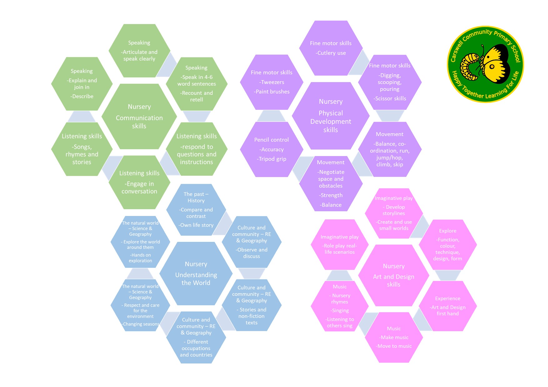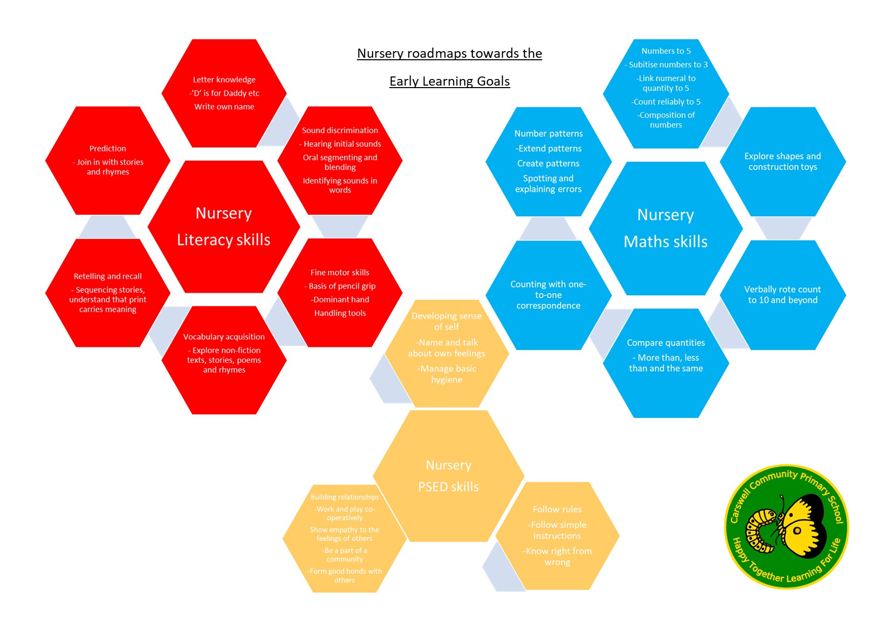 The first lesson our EYFS children learn about when they start school with us is our school ethos is ‘Happy together, learning for life’. We reinforce this throughout the school with three simple rules: be kind, be safe and be respectful. This message is taken with our children throughout their school journey at Carswell Primary School.