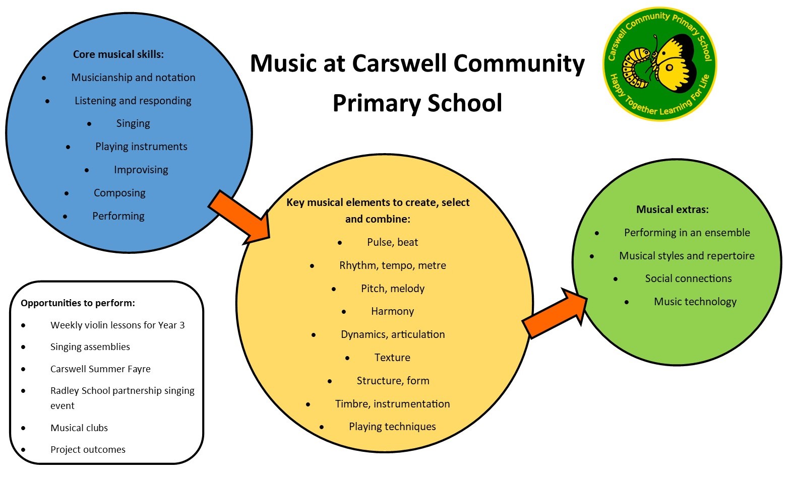 Children at Carswell have the opportunity to engage with music of all styles and from all cultures. Through the use of Charanga’s Model Music Curriculum and our teachers with specialist knowledge and musical talents, children are immersed in music-making activities that deepen over the course of the six school years. Musical skills are reinforced each year, and children are offered challenges to apply their knowledge and understanding.